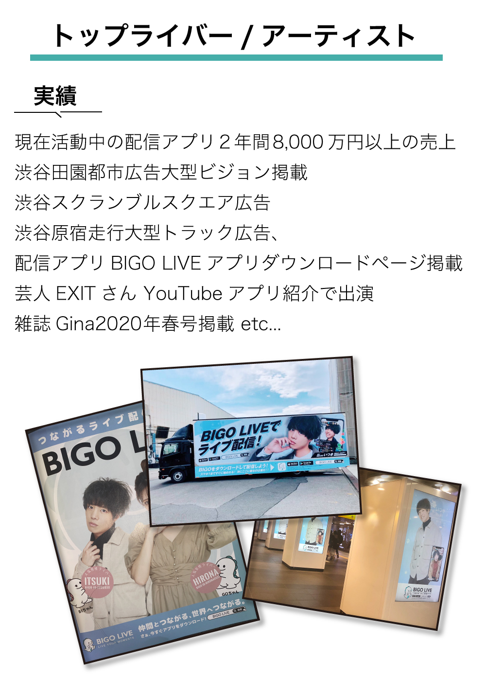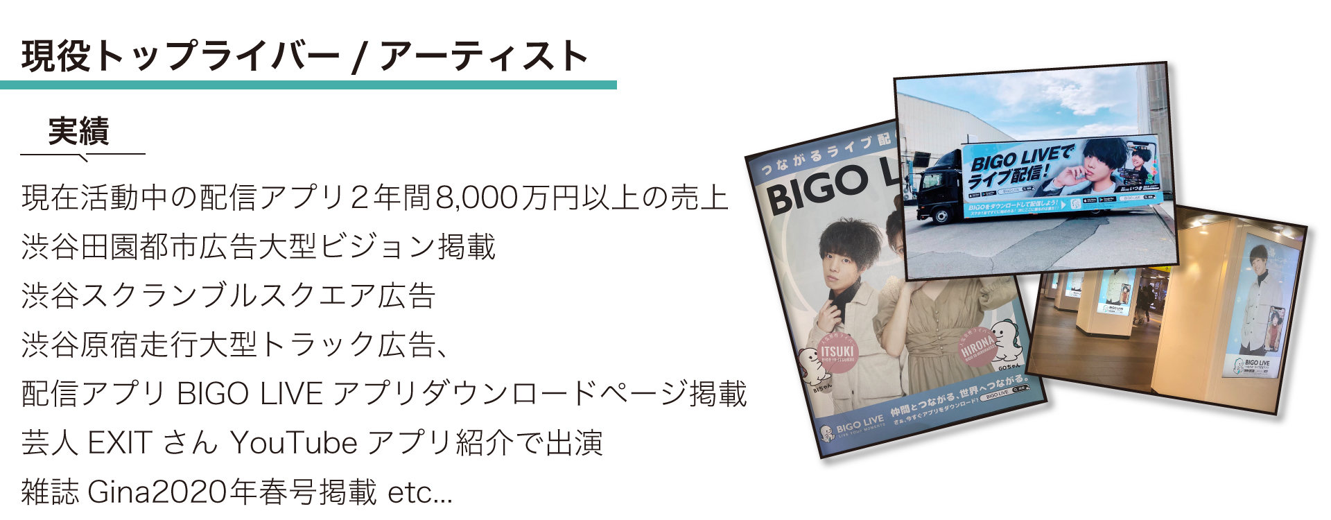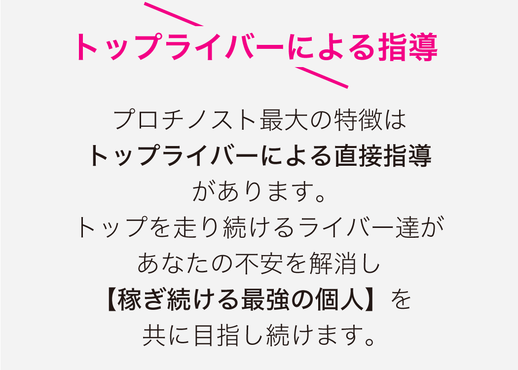 8000万円以上を売り上げてきたトッププレイヤーが直接マネジメントし「最強の個人」を1から育成していきます。インフルエンサーになって収入を得ていくだけでなく日々自分を磨いている仲間や、今までになかった人脈がここにはあります。ライブ配信に興味が少しでもあるなら、まずはご連絡ください。 配信レクチャー 厳選された配信経験者があなたの配信をサポートをします初めに必要な機材、配信機能、配信時間、配信リアクションなどトップライバーがどのように今まで売上を上げてきたかなど、レベルごとにあなたをサポートします。 毎月の定例会 定期的に代表などのトップライバーによるオンライン定例会があります。そこでは直接、配信などの疑問にお答えしていき流れが早い配信の世界で安定的に数字が取れるように、毎月アップデートを共有します。 アフターライフ 配信にて資金や自身のファンを獲得しつつ、最強の個人を目指すべく次のマイビジネスを展開する設計やアシストをします。配信はスタートに過ぎず、自己実現を早める一つのツールです。あなただけのHP、ネットショップ(グッズや自身のブランド)、箱ライブなど、個人での次のビジネス展開をサポートします。 コミュニティ 1人1人が最強の個人を目指す仲間となり様々なことを共有していきます。互いの得意なことを把握し協力することで、思わぬ化学反応を起こすことも多くあり想像もしなかった自分に出会えます。 まずは、LINEから無料で問い合わせが出来るので気軽にご連絡をくださいませ。ご不明点は全てここで解決致します。 お名前やお住いや目標など簡単なことをいくつかお聞き致します。難しいことは聞かないのでご安心下さい。 事務所に仮で所属していただき、仮配信をしていきます。配信までのことは全てサポート致します。費用や事務所からのノルマなどもないので充実したサポートにより、気軽に始めることが出来ます。 当事務所での配信を決意していただけたら本契約となり、プロチノストの公式ライバーとしてそれぞれの目標に向けて共に励みましょう。 未経験でも出来ますか? 配信未経験でも大丈夫です。今までやってきた好きなことやスキルを配信で活かせます。 所属するのに費用はかかりますか? 所属するのに対して費用がかかることはございません。気軽にお問い合わせくださいませ。 配信を始めるには何が必要ですか? まずは配信環境を整えることです。 次に配信出来る時間をしっかり確保することです。最初は継続するために少しずつ慣らしていきますが、結果を出すためには一定以上の配信時間が必要です。 ただ、ご安心下さい。求める数字によって行動は変わりますので、寄り添った提案をしていきます。 年齢制限はありますか? 一切ありません。配信は、若ければいいということはなくその人の個性があればいくらでも輝ける世界です。年齢に制限はないので、是非ともチャレンジしてみてください。 地方住みでも出来ますか? もちろん可能です。配信のいいところは、ネット環境さえあれば誰でも発信出来るところにあります。定例会もオンラインで行うので、地方だからといって差が出来ることもないのでご安心下さい。 YouTubeの企画みたいなのは毎日考えられないのですが、それでも大丈夫ですか? 配信はYouTubeのように毎日企画を考えてやるものではありません。もちろん見ているリスナー様に楽しんでいただくために企画を組むことはありますが、友達とご飯に行くときたわいもない話であっという間に時間が過ぎるのと同じで、配信はコミュニケーションを楽しむ場を作るということが1番の軸になります。毎日企画を考えられなくても大丈夫です。(それよりも大事な人と出会うきっかけ、仲良くなるきっかけを作ることの方が大切です) たくさん稼げますか? 見てくださっているリスナー様の投げ銭が報酬になりますので喜んで頂ける出来る配信者になれれば、報酬はアップし続けます。一緒に沢山の人を喜ばせられる人に成長しましょう。 配信は楽しいですか? とても楽しい世界です。悔しいこともありますし、辞めたいと思うことも何度もあります。 だけど、気づいたら沢山の人に支えられていて、気づいたら今日も待ってくれている人がいます。何も無かった自分が、配信を通してさまざまな経験や、チャレンジ出来なかったことにチャレンジ出来る様になり、今もまだまだ新しいチャレンジが出来ています。自分が叶えたかった夢が、いつしか誰かにとっての夢にもなる。 配信はすごく面白く、色んな方にとって進化できる場だと思っています。 はじめまして、代表のいつきです。当事務所をご検討いただきありがとうございます。現配信サイトにて2年間で8000万以上の売上を出しているトッププレイヤーとして現在も精力的に活動しています。当時お金もなく、自分のことを見てくれるファンも居なかった。そんな所から生配信に出会い、今では夢にも思わなかった経験や結果